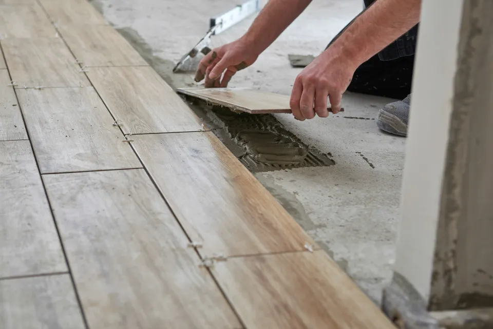 Installation de carreaux qui reproduisent l'aspect du bois, de la pierre ou du béton pour un style authentique sans les inconvénients.